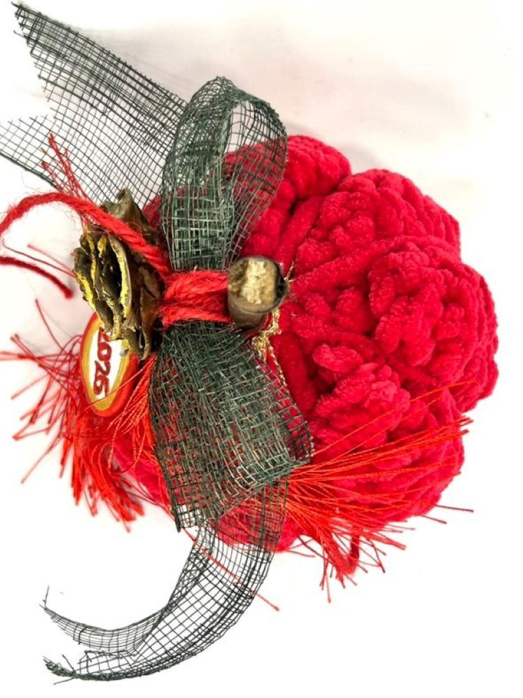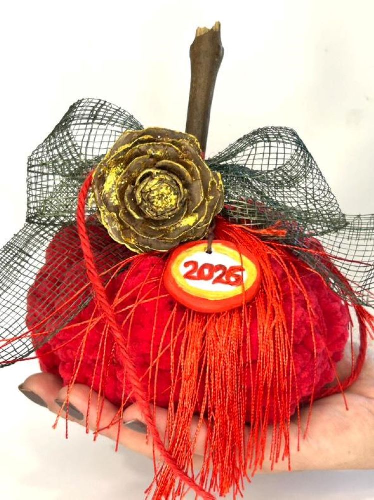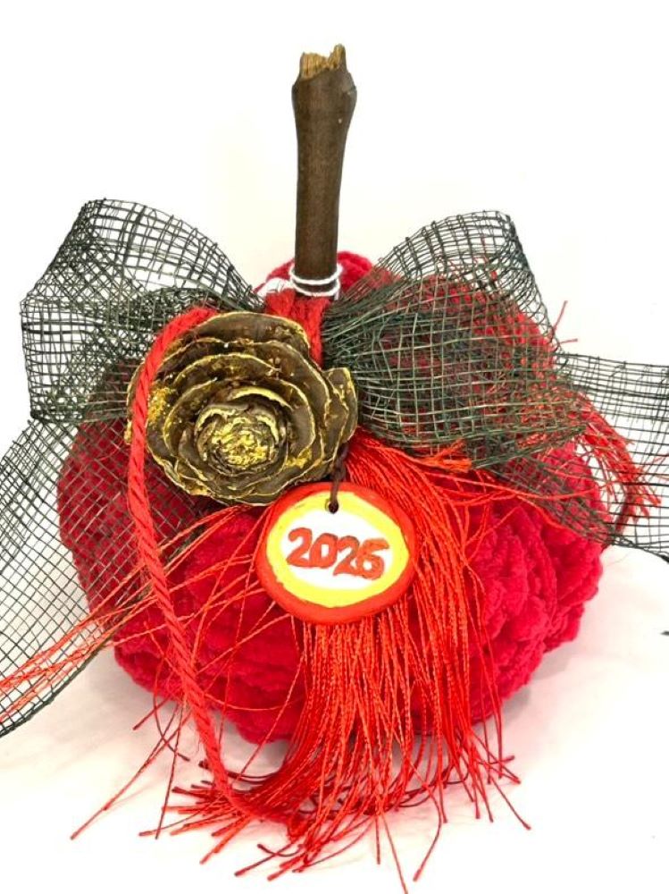 Χειροποίητη πλεκτή κολοκύθα σε έντονη κόκκινη απόχρωση, διακοσμημένη με χρυσές λεπτομέρειες και γούρι “2026”. Ιδανική για εορταστική και πρωτοχρονιάτικη διακόσμηση.