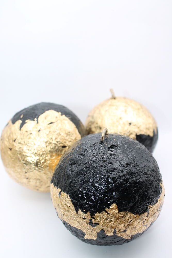 Σετ τριών χειροποίητων χριστουγεννιάτικων μπαλών από papier mâché, διακοσμημένων με φύλλα χρυσού, για κομψή και γιορτινή διακόσμηση.
