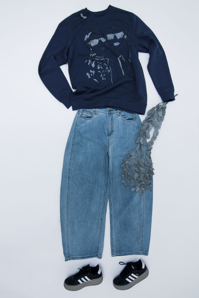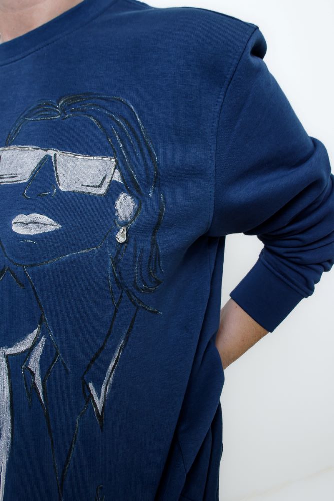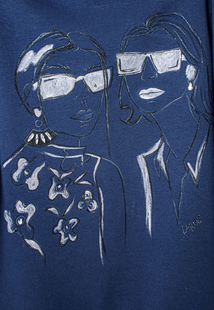 Το μπροστινό μέρος είναι ζωγραφισμένο στο χέρι, απεικονίζοντας δύο φιγούρες με statement στιλ, ενώ στρας κεντημένα πάνω στο σχέδιο χαρίζουν λάμψη και τρισδιάστατη υφή.