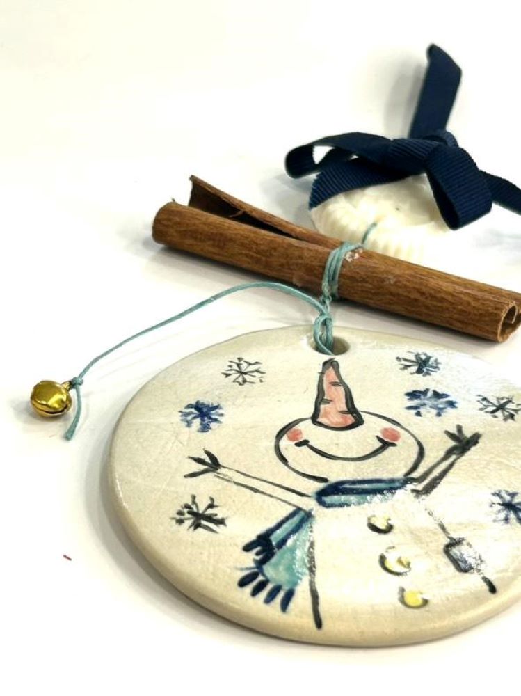 Αυτό το χειροποίητο πήλινο χριστουγεννιάτικο στολίδι συνδυάζει την παραδοσιακή αισθητική με τη χειροποίητη τέχνη και το άρωμα των Χριστουγέννων. Ο χαρούμενος χιονάνθρωπος ζωγραφισμένος στο χέρι αποτυπώνεται πάνω στο πήλινο στοιχείο, προσδίδοντας μοναδικότητα και αυθεντικότητα σε κάθε κομμάτι.
