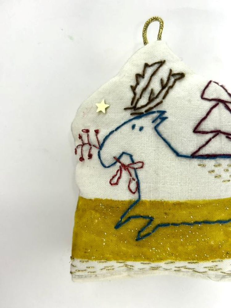 Χειροποίητο υφασμάτινο χριστουγεννιάτικο στολίδι σε σχήμα σπιτιού, κεντημένο στο χέρι με παιχνιδιάρικο ελαφάκι και ζεστές, φυσικές αποχρώσεις.