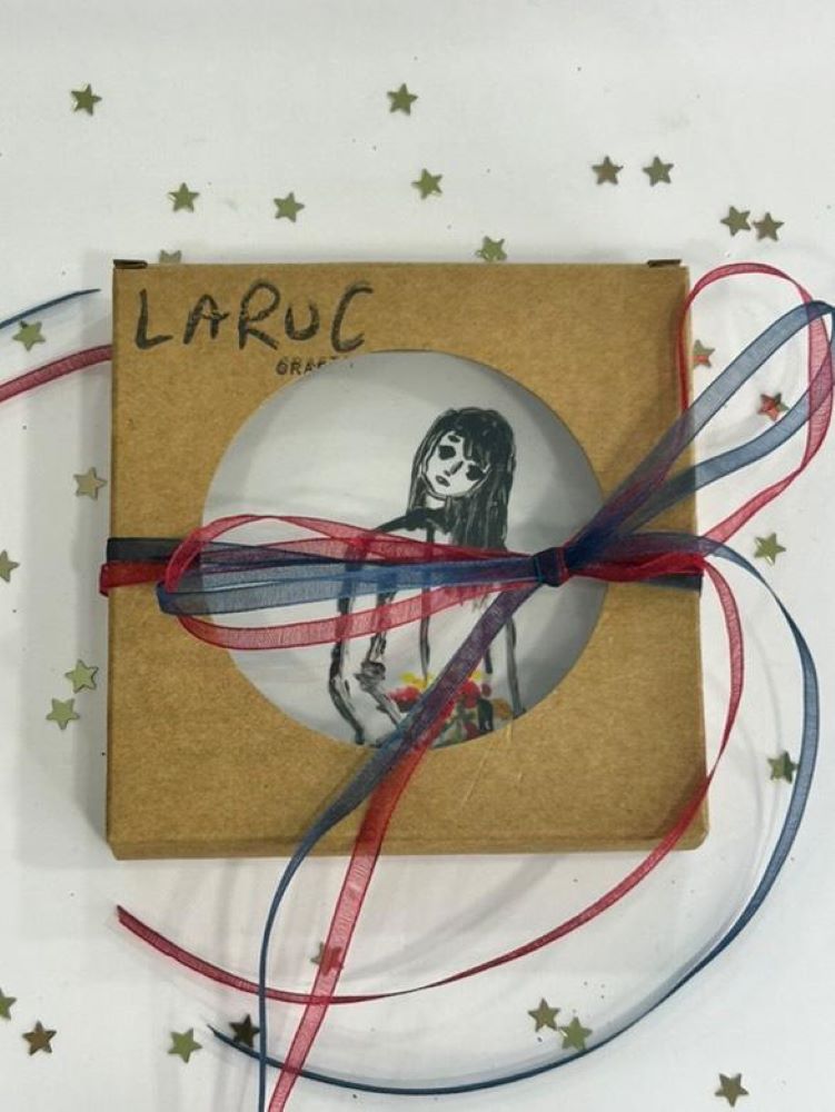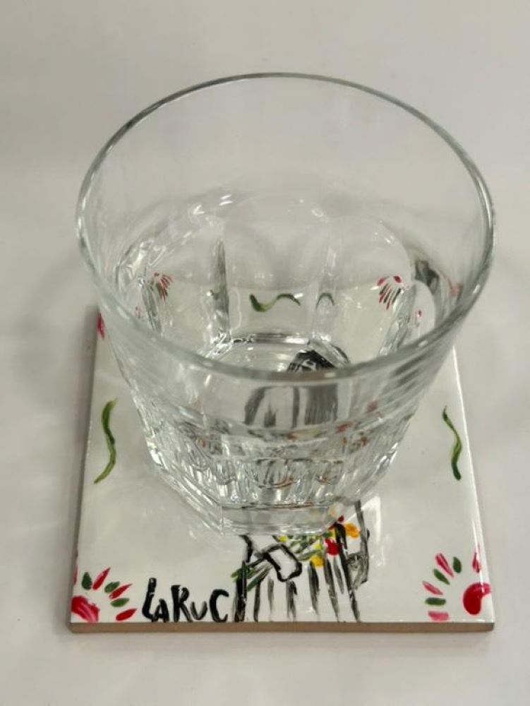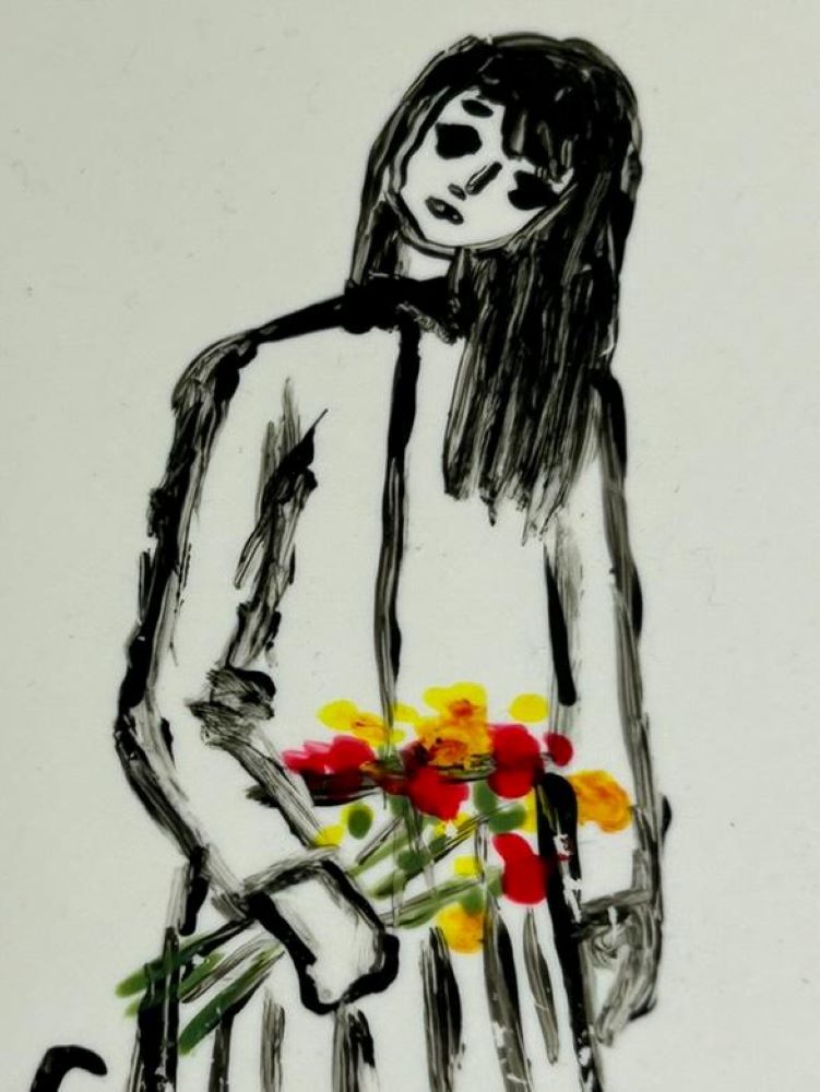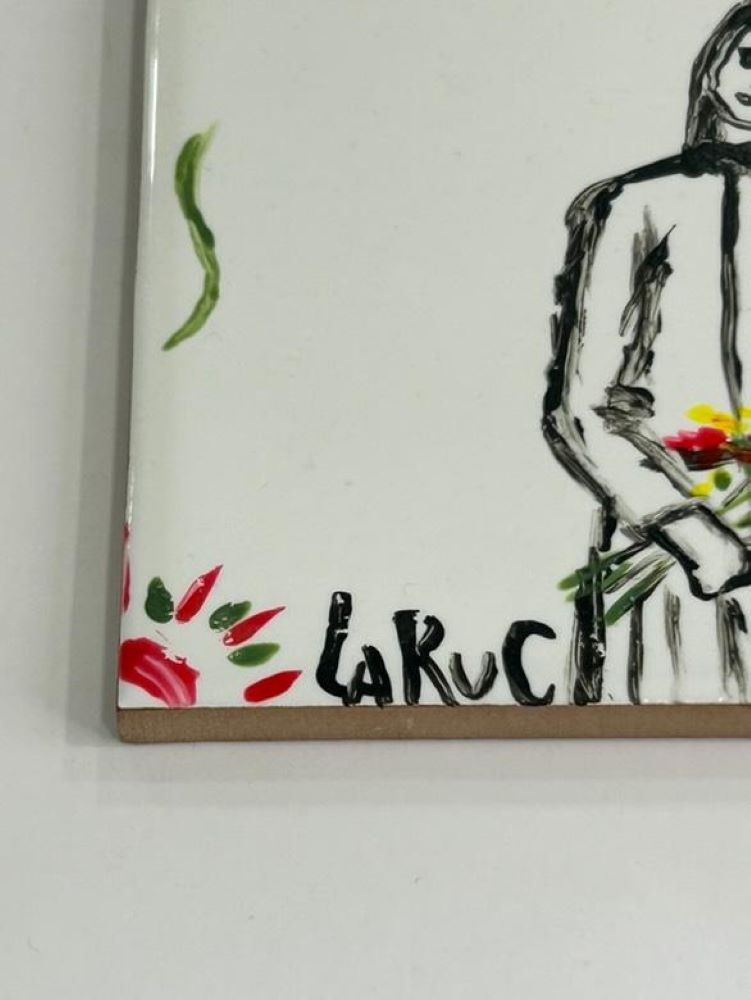 Αυτό το χειροποίητο πλακάκι απεικονίζει μια αέρινη γυναικεία φιγούρα που κρατά ένα μικρό μπουκέτο λουλουδιών, αποδοσμένη με ελεύθερες, αυθόρμητες γραμμές και λεπτές χρωματικές πινελιές. Το σχέδιο συνδυάζει τη λιτότητα του ασπρόμαυρου με ζωντανές πινελιές χρώματος, δημιουργώντας μια αίσθηση ρομαντισμού, ευαισθησίας και εσωτερικής δύναμης.