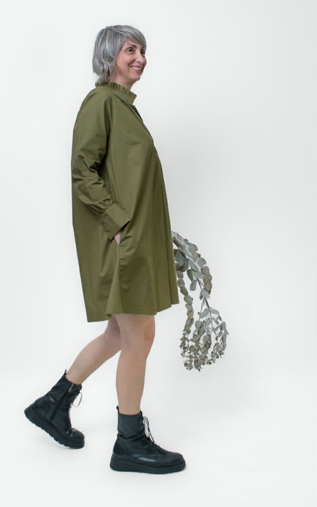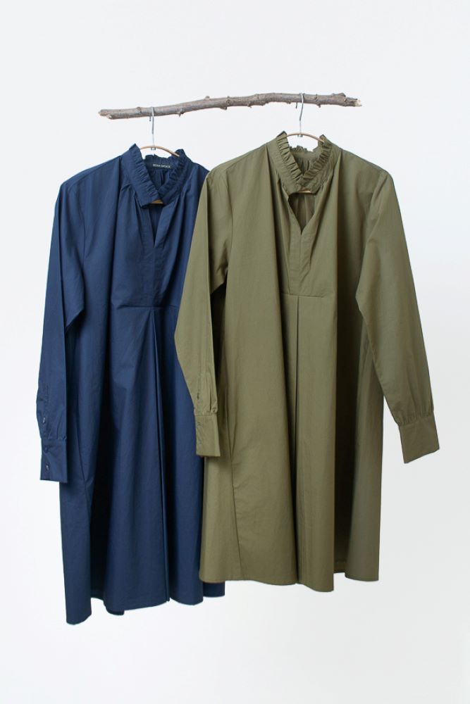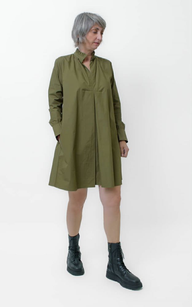 Ο όρθιος γιακάς και η καθαρή V γραμμή στο μπούστο δημιουργούν μια εκλεπτυσμένη σιλουέτα, ενώ η soft A-line γραμμή του φορέματος προσφέρει άνετη εφαρμογή που κινείται φυσικά με το σώμα. Τα μακριά μανίκια με μανσέτες προσθέτουν μια διακριτική πινελιά πολυτέλειας.