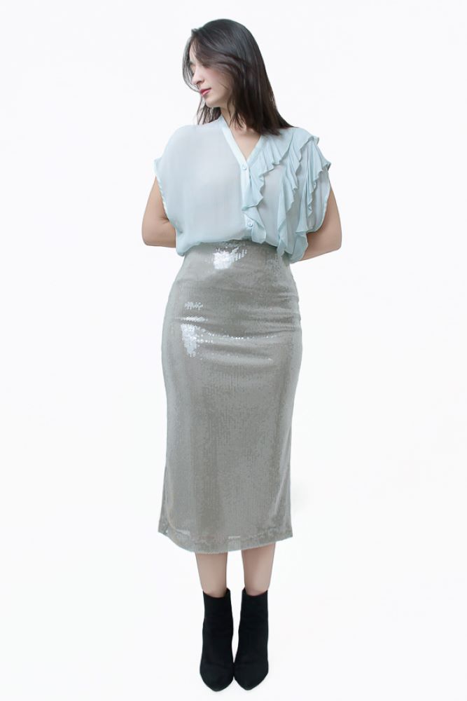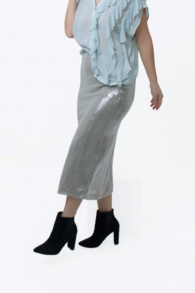 Εντυπωσιακή midi pencil φούστα με παγιέτες, που αγκαλιάζει τη σιλουέτα και χαρίζει λαμπερή, κομψή παρουσία σε κάθε εμφάνιση.
